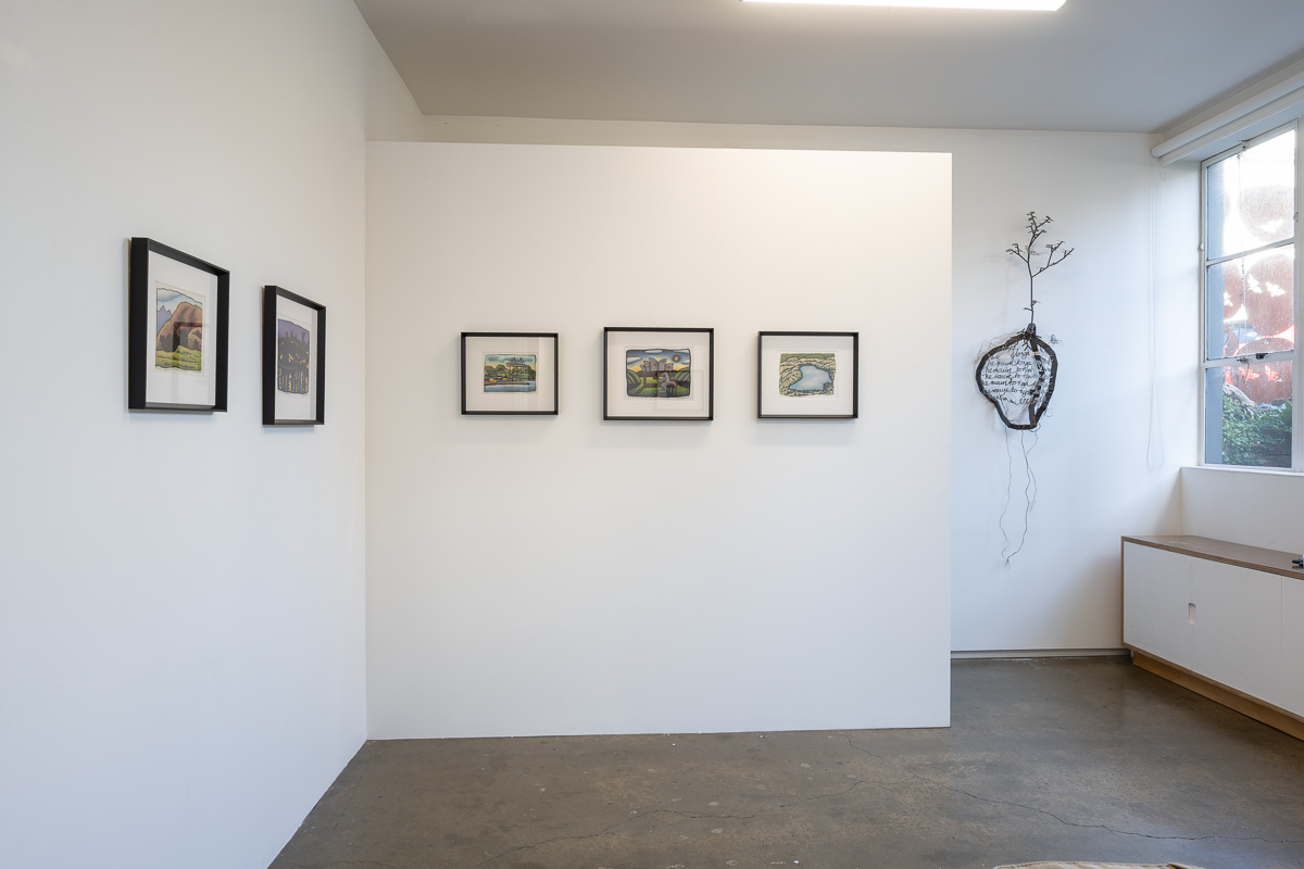 McCahonno set with rusty roof and kengarewe, 2025, charcoal, coloured pencil on paper, 385 x 455 mm (framed) 220 x 290 mm (visible area), $4500 (framed)