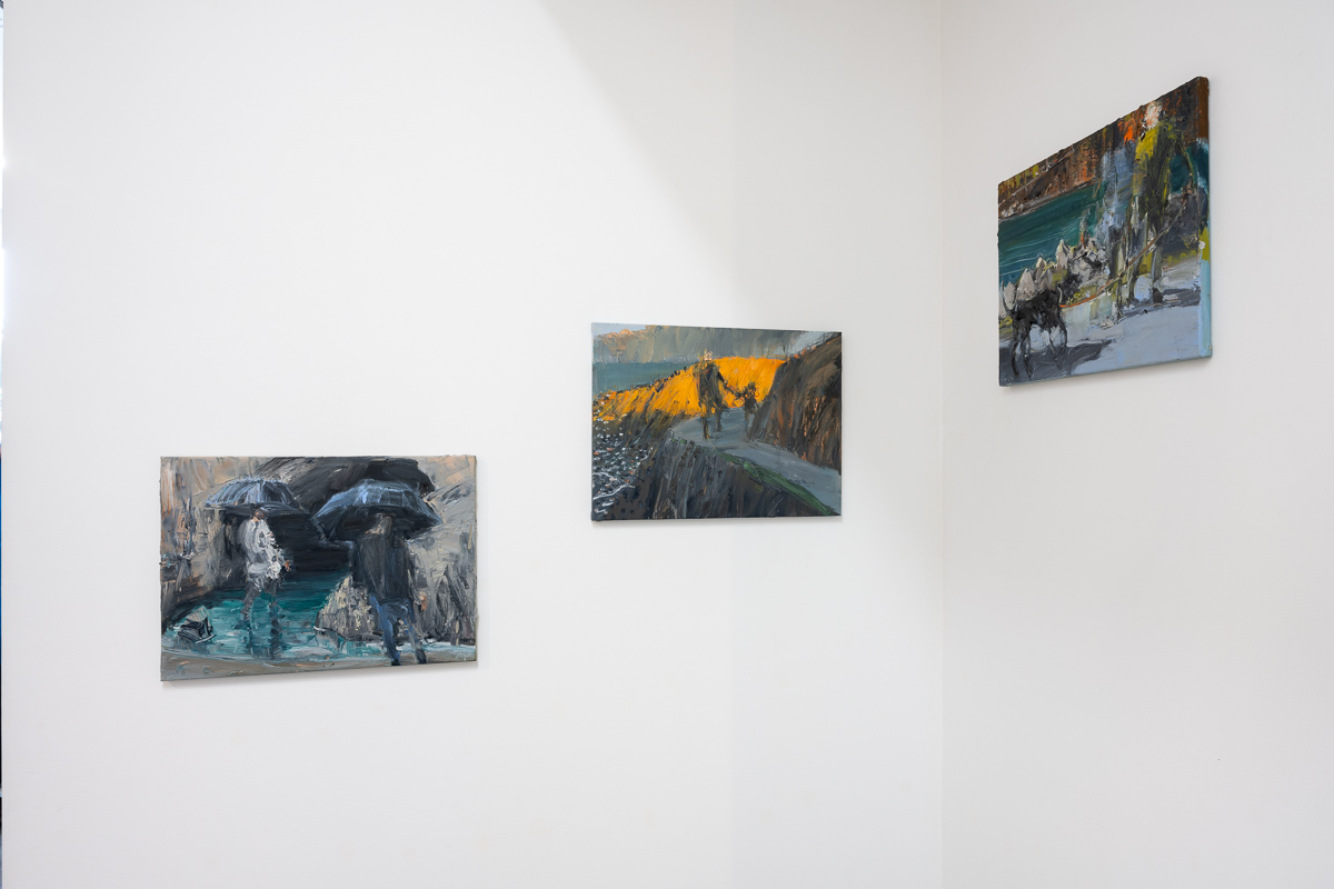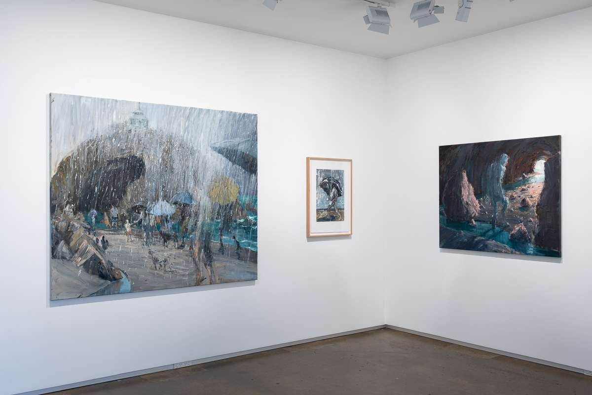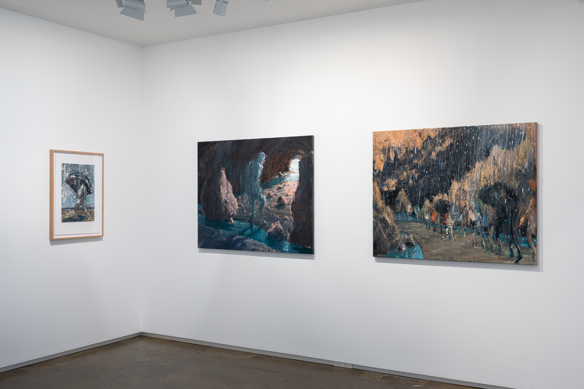 To an extent, Macleod’s external landscapes are a means to an end, a world for these figures to pass through. They are not merely set-dressing, however. Environments consume these figures, ensuring they exist in relation to their surroundings. Dark, daunting cliffs and sinister skies allow for different possibilities for viewers to explore, than those of golden hills with walkways high above sparkling suburbs. The sense of place is an especially key signifier within …a murmuring cave of the sea…. The paintings here are all based on areas around Christchurch and on the Kaikōura coast. The environments are specific enough for the elements to feel convincing, to anchor these journeys in reality. You can feel the lashing rain, or the late-afternoon chill. And yet, the bones are familiar enough to hint at a non-specific, universal experience of navigating the intersection between the internal and the external.
