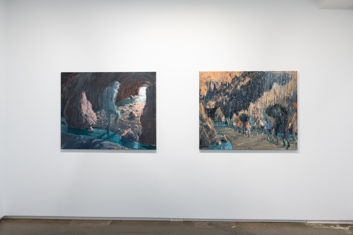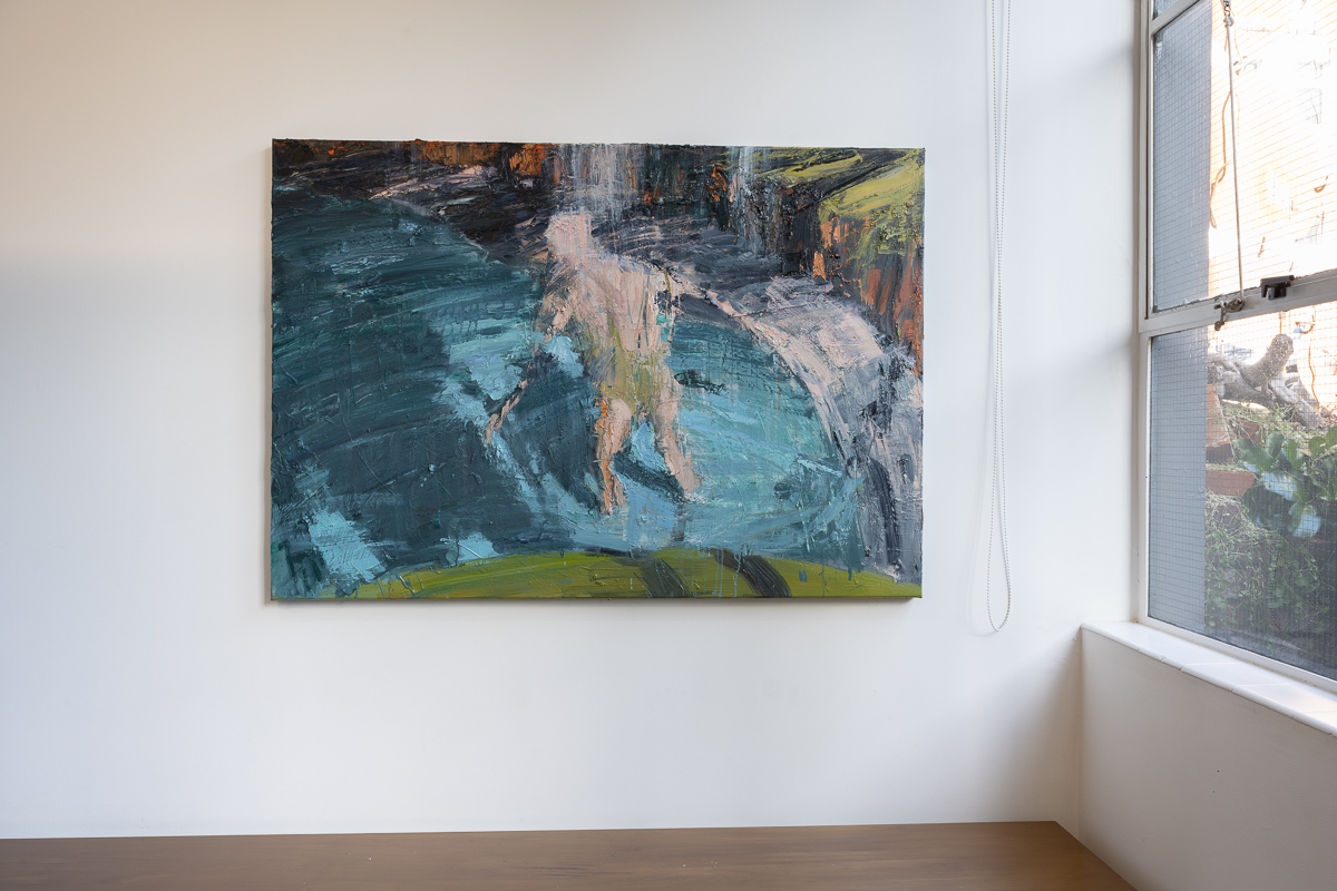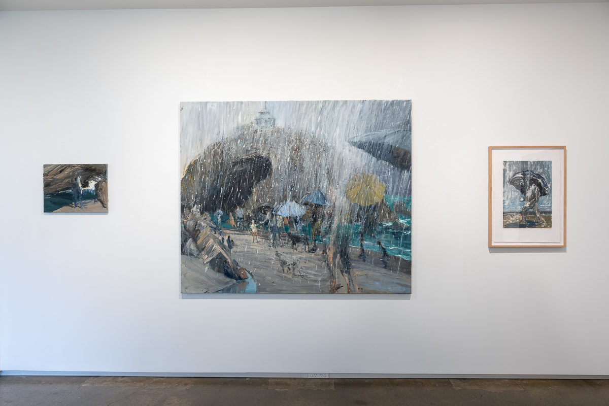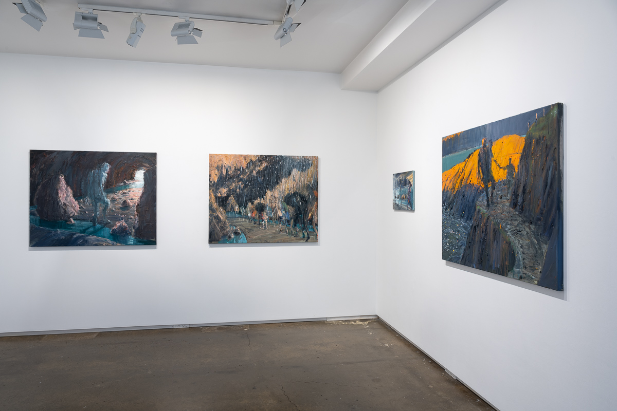 To an extent, Macleod’s external landscapes are a means to an end, a world for these figures to pass through. They are not merely set-dressing, however. Environments consume these figures, ensuring they exist in relation to their surroundings. Dark, daunting cliffs and sinister skies allow for different possibilities for viewers to explore, than those of golden hills with walkways high above sparkling suburbs. The sense of place is an especially key signifier within …a murmuring cave of the sea…. The paintings here are all based on areas around Christchurch and on the Kaikōura coast. The environments are specific enough for the elements to feel convincing, to anchor these journeys in reality. You can feel the lashing rain, or the late-afternoon chill. And yet, the bones are familiar enough to hint at a non-specific, universal experience of navigating the intersection between the internal and the external.