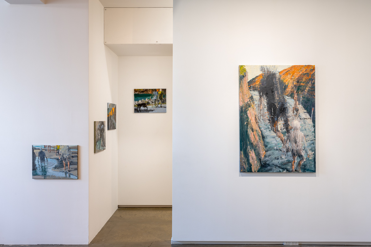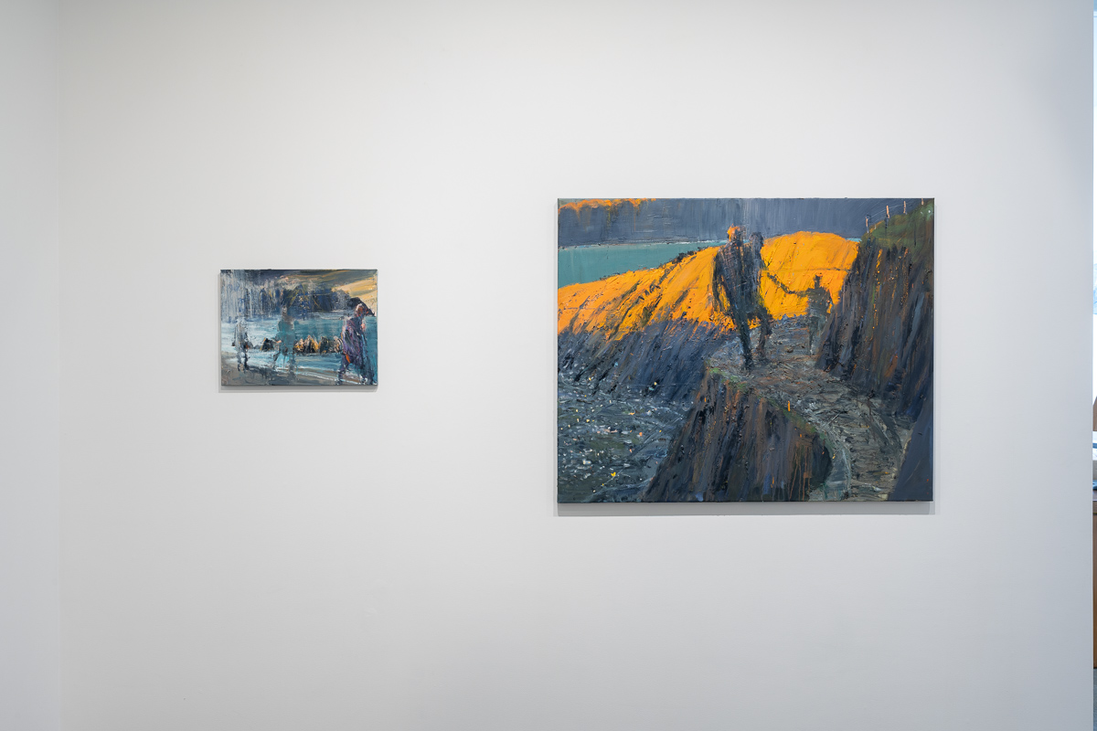 There are also the layers of nuance built into each painting, the different places these works can take you. Euan’s work tends not to be overtly conceptual or narrative driven. It seeks, instead, to elicit a personal response from the viewer. There are figures in these landscapes, which provide a reference point and invite reflection. Their intentions are unclear. Their forms are obscured. There is an almost void- like absence of detail, which creates a space into which the viewer can insert themselves. The artist is not telling you what to think, he is inviting you to participate. You can be an occupant or an observer – do you identify with these figures, and the journey they are on, or do they remind you of someone you love? Is that person still with you, or must you conjure them through the haze of memory?