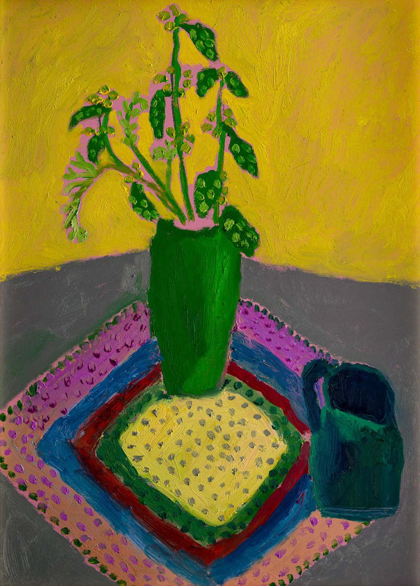 A self taught still-life painter, working mainly in oils, she is inspired by her personal environment. Every window of her home overlooks lush, overgrown and much loved gardens, where wildlife thrives. She finds joy in the pleasure of quiet meditation on these subjects. It is ever present in her work. She is a collector, a frequent op-shopper. As a result her studio is filled with the accoutrements of still life – jugs, urns, arrangements of flowers, foliage, weaving, fabrics and a sizeable library of art volumes, all providing constant inspiration.