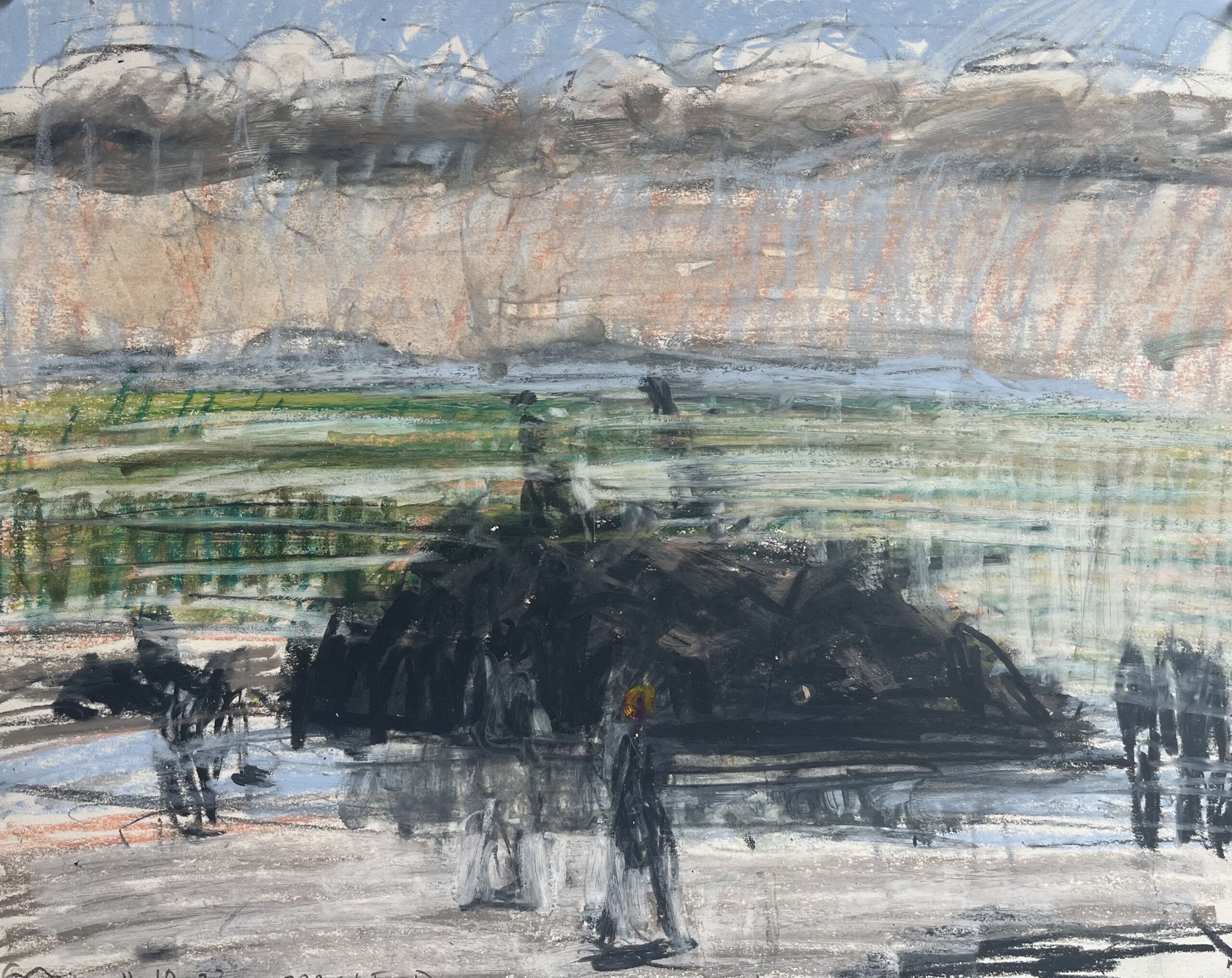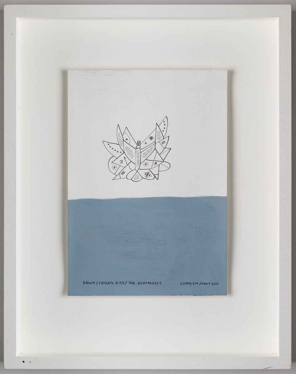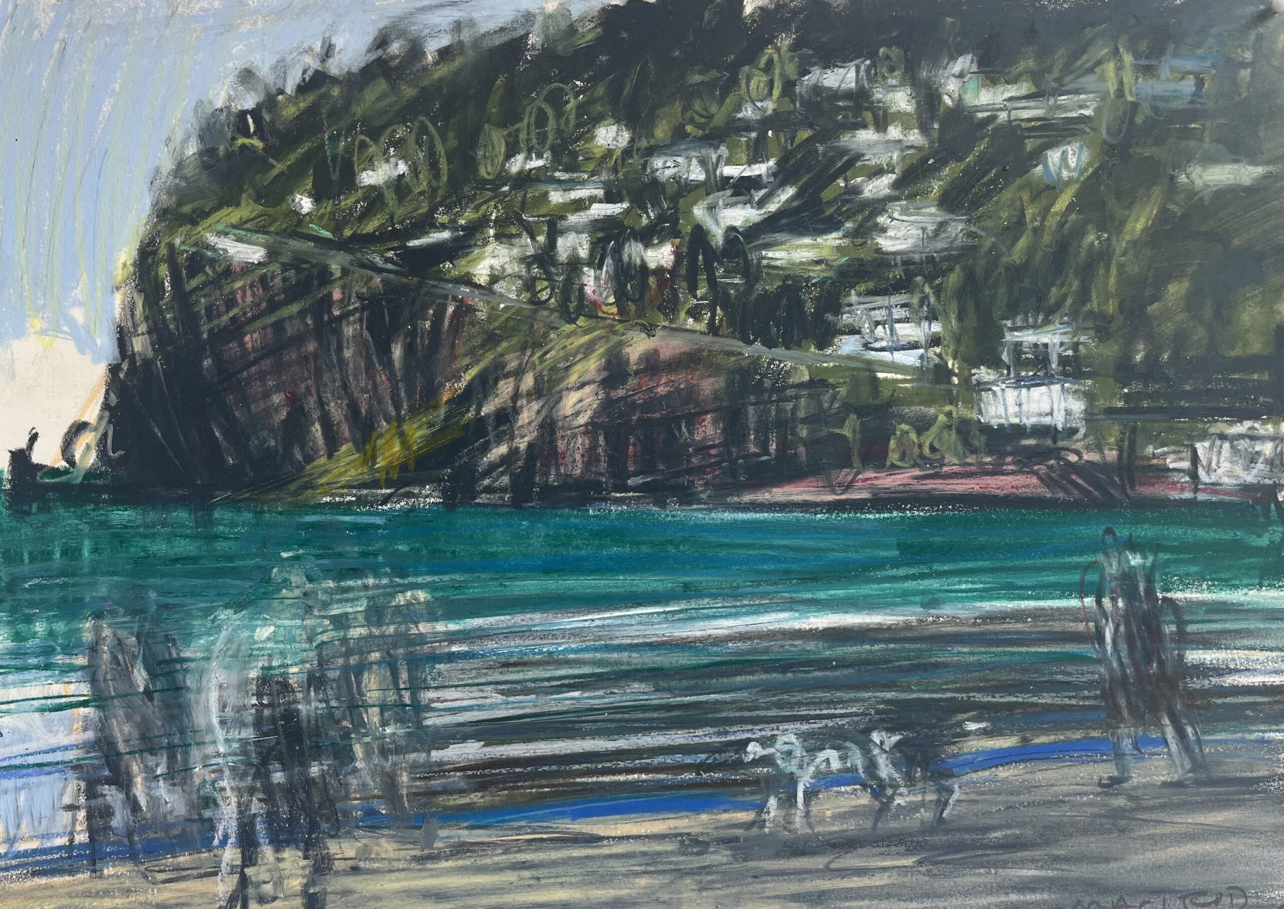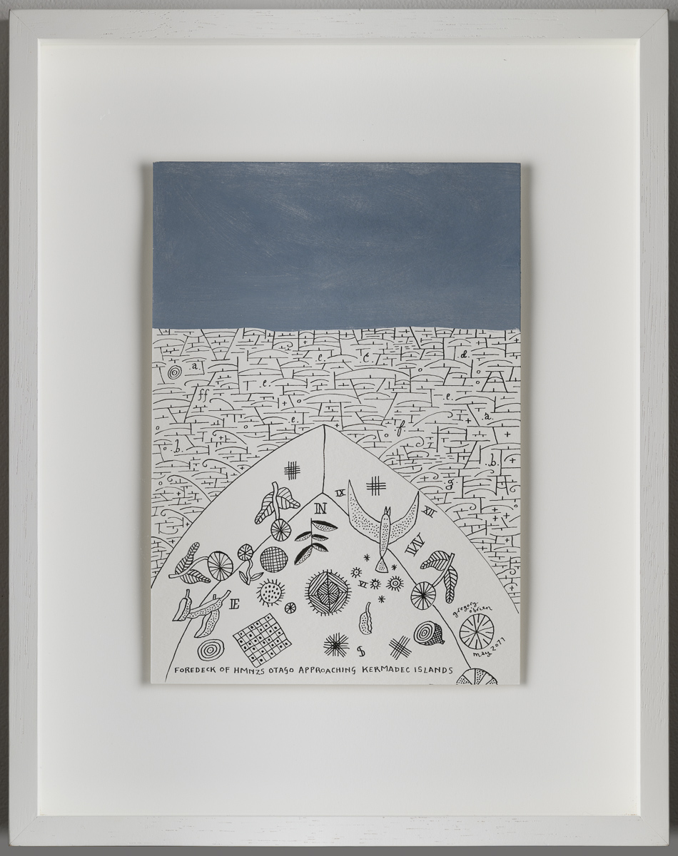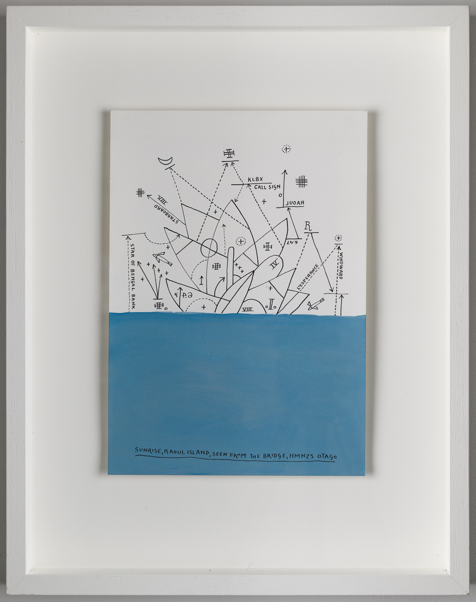 Accompanying the two ‘Flotilla’ paintings in the window are a number of works on paper from the 2011 ‘Kermadec’ art project. On that occasion I found myself standing on the deck of a naval vessel—the HMNZS Otago—bound for Raoul Island and then Tonga. In the good company of the officers and ratings of the New Zealand navy, it was as if the Peace Squadron had found some kind of accommodation within the multi-cultural, environmentally focussed organisation which is our present-day Te Taua Moana o Aotearoa. These drawings chart our vessel’s voyage north and early morning arrival at Rangitahua/Raoul Island. The notion of ‘sanctuary’ which provided the title for my 1983 painting lay at the very heart of the Kermadec art project and much of my subsequent art-making.