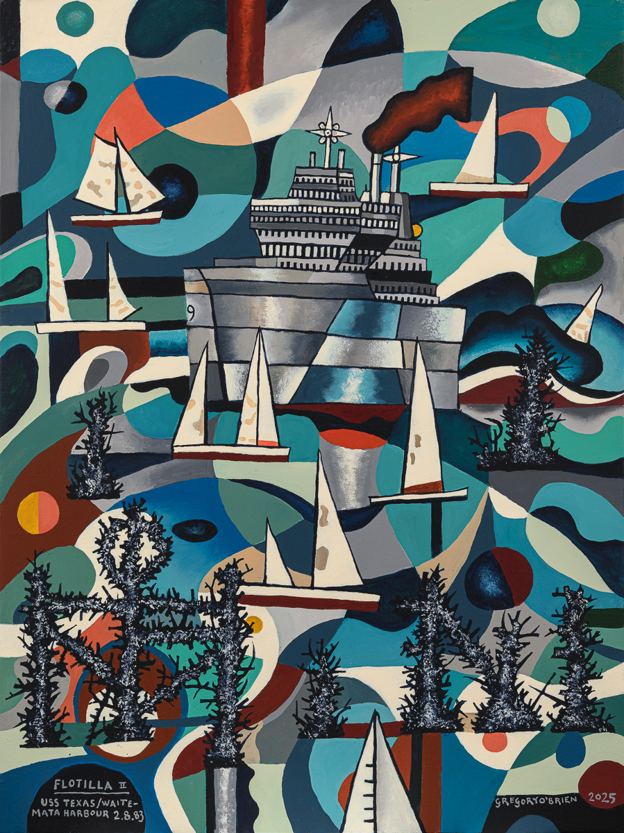 I hope these two new paintings capture something of the positive energy and wairua of the anti-nuclear flotilla. I devised the paintings while visiting Japan in April 2024. While in Hiroshima, my memories of the USS Texas protest came vividly back to me. Given recent events in the world, it feels like a good time for us all to be thinking about war and peace, protest and the direction in which we are heading. Gregory O’Brien, January 2026
