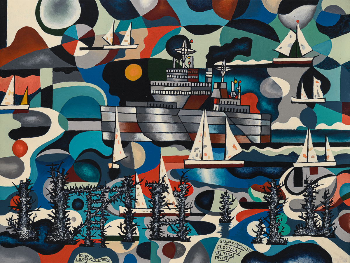 The first painting I ever sold through a dealer gallery—this was in November 1983—was a poster-like rendering of an American nuclear-powered cruiser, the USS Texas, steering a course through a flotilla of protest vessels in the waters between Devonport and the rickety, barnacle-encrusted pilings off Okahu Bay…